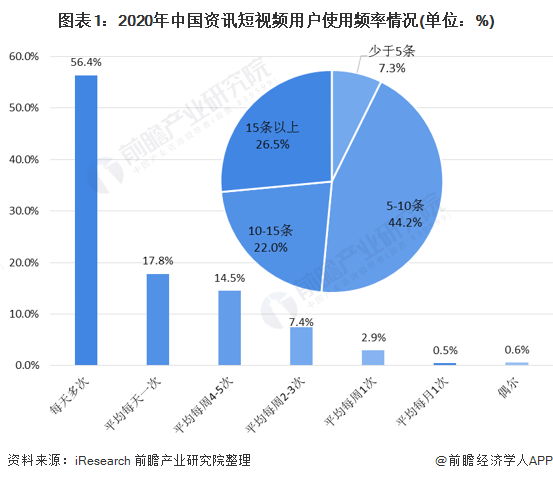 根据iResearch公布的调研数据显示,我国资讯短视频用户观看资讯短视频的主动性较强,有56.4%的被调研用户每天多次观看资讯短视频,在高频用户中平均每次观看15条以上的用户比例达26.5%,表明平台核心用户具有较高的内容粘性。