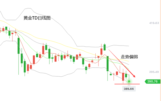 黄金TD:受人民币持续升值影响,黄金TD同阶段跌势相对国际黄金更大,周一金价刷新近四个多月来新低389.68元后向上反弹,但涨势并未得到延续,周三金价在此下跌,并刷新四个月新低至389.66元,走势偏弱,存在进一步下行的风险。支撑方面,关注本周低点389.6元附近,这也是目前日线布林带下轨附近,下方空间不足,布林带向下开口需要时间,预计短期内金价将承压企稳,上方1小时和4小时周期阻力分布多而密集,主要关注1小时布林带中轨与4小时5日均线392.2元附近,突破这里缓解短期下行压力,继续关注日线5日均线393.8元附近。总体而言,尽管黄金TD走势偏弱,但当前价格偏低,看空风险较大,需要金价继续刷新四个月新低才有足够空间,同时金价短期反弹乏力,因而建议保持观望,或关注本周低位389.6元附近谨慎看涨,