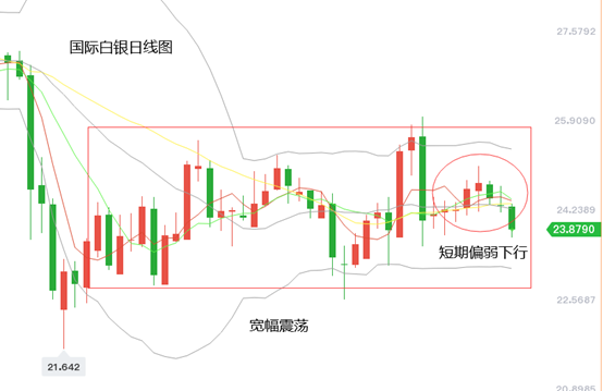 国际白银:国际白银承压下跌,短期走势偏弱,日内银价刷新一周新低23.72美元,与上周白银跳水后反弹回落低点23.75美元基本持平,随后白银小幅反弹,但未能突破24美元整数关口,在这里遇阻继续承压。白银1小时和4小时布林带向下开口,银价承压沿布林带下轨向下运行,走势偏弱,而上方短期阻力分布多而密集,短期反弹难度较大,不过整体走势上白银近两个月维持宽幅震荡,没有明显的方向趋势。支撑方面,首先关注23.72美元附近,其次上周白银跳水低点23.55美元附近,以及日线布林带下轨23.13美元附近,上方阻力关注24美元整数关口,其次4小时5日均线24.15美元附近,日线布林带中轨24.25美元附近,以及日线5日均线和10日均线24.4美元附近。总体而言,白银整体宽幅震荡,短期走势承压下行,建议关注24美元关口看跌,突破看反弹。