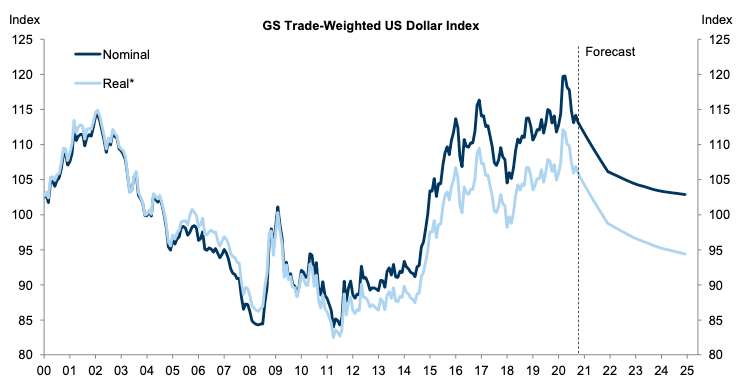 高盛预测2021年美元将持续而有序地下滑(下图虚线右侧所示)