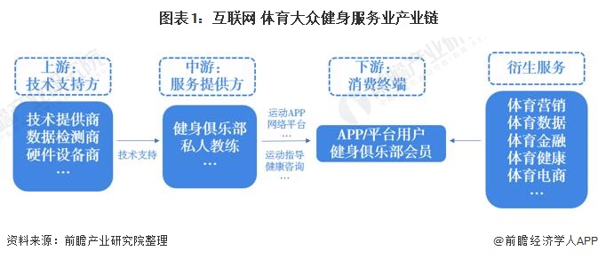 互联网+体育大众健身产业链的上游为基础支持方;产业链中游为提供服务的各类型健身俱乐部、私人教练,通过运动APP、健身平台和直播平台等媒介为用户提供服务;产业链下游为用户和健身俱乐部会员。同时,服务提供方也会对用户衍生价值进行挖掘。