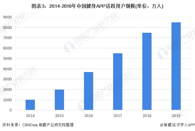 2018年我国健身APP活跃用户规模突破7000万人。2019年,越来越多的健身APP不断丰富软件内容适应用户的多元化需求,健身APP活跃用户人数再创新高,接近9000万人。