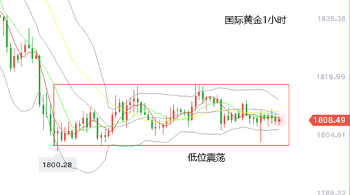 国际黄金:目前维持低位窄幅无序震荡,没有明确的方向性。下方支撑方面,关注1小时布林带下轨1805美元附近,重点关注1800美元关口位置,跌破将打开下行空间;上方阻力方面,关注1小时布林带中轨1810美元附近,其次1小时布林带上轨1815美元附近。目前国际黄金围绕1小时布林带震荡运行,布林带处于走平状态,市场交投清淡,投资者关注主要支撑与阻力位即可,尤其是1800美元关口得失情况。