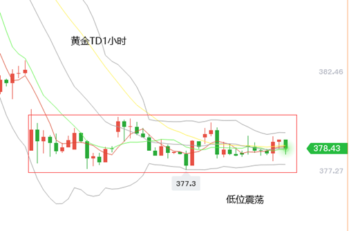 黄金TD:同国际黄金一样,低位震荡整理,短期没有明确的方向性。下方支撑方面,关注半年来新低377.3元附近,近期多次试探企稳,同时也是1小时布林带下轨附近,上方阻力方面,关注1小时布林带上轨379.2元附近,其次低位反弹高点380元附近。目前黄金TD波动较小,金价围绕1小时布林震荡运行,重点关注布林带上下轨支撑与阻力位置的得失情况即可。