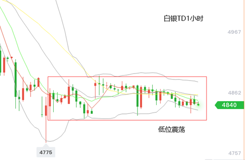 白银TD:和国际白银一样,窄幅震荡,波动较小。下方支撑方面,关注1小时布林带下轨4830元附近,其次4800元整数关口位置,上方阻力方面,关注1小时布林带中轨4855元附近,其次1小时布林带上轨4880元附近。白银低位盘整,关注短期主要支撑与阻力位置即可。