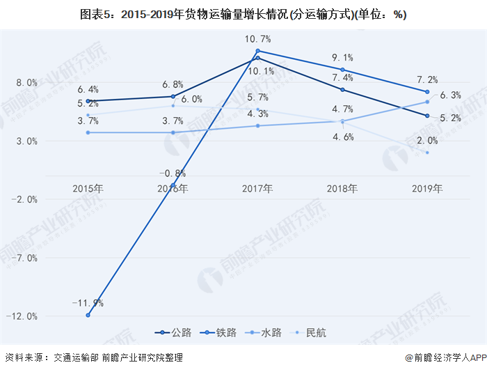 2017年开始,中国铁路货运增速超过其他运输方式,达到10.7%,而公路货运量增速开始下滑,到2019年下降到5.2%;2019年水路货运增速超过公路运输,达到6.3%,国内运输结构调整政策作用明显。