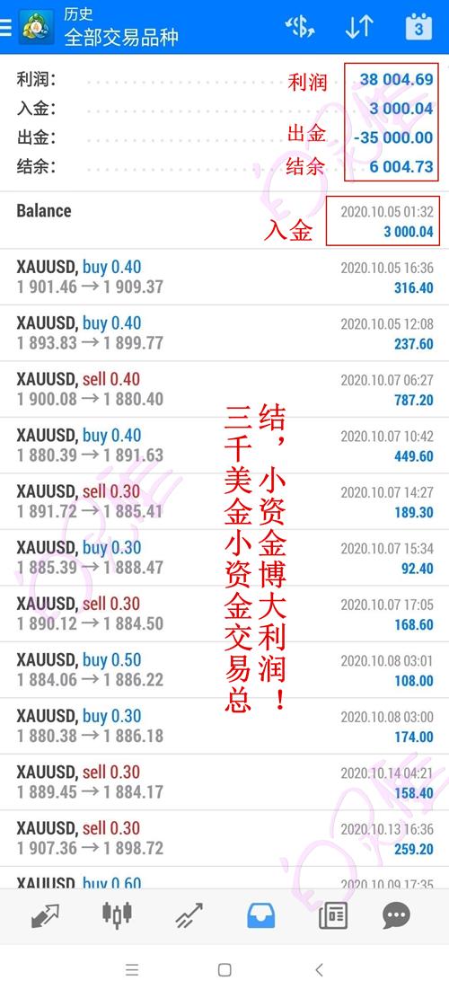 以下为灵雁学员唐姐的交易记录,2020年10月份入金,平时以短线小波段利润为主,单量不固定,但利润是可观的,账户本金三千美金,目前已出金三万五美金。