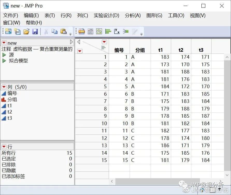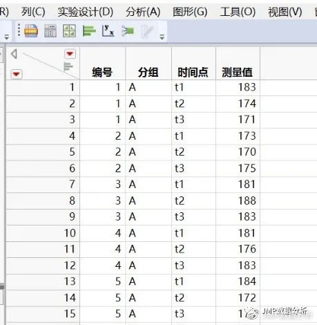 首先看一下重复测量的示例数据,共15个被试者,分为三组接受不同处理,重复测量三次,数据(截取部分)如图1。