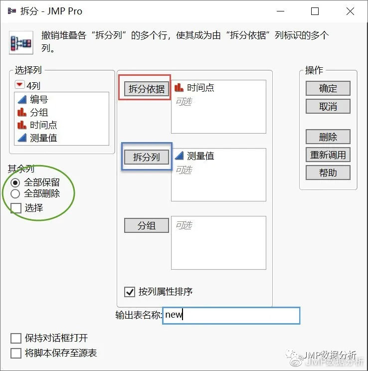 打开拆分对话框,如图3。这里,我们将时间点放入拆分依据框中,然后将测量值放入拆分列,即根据时间点对测量值进行拆分,拆分为与时间点个数相同数量的列。其余列我们可以选择全部保留,如果后续分析用不到,也可以选择全部删除,或者手动选择想保存的列。