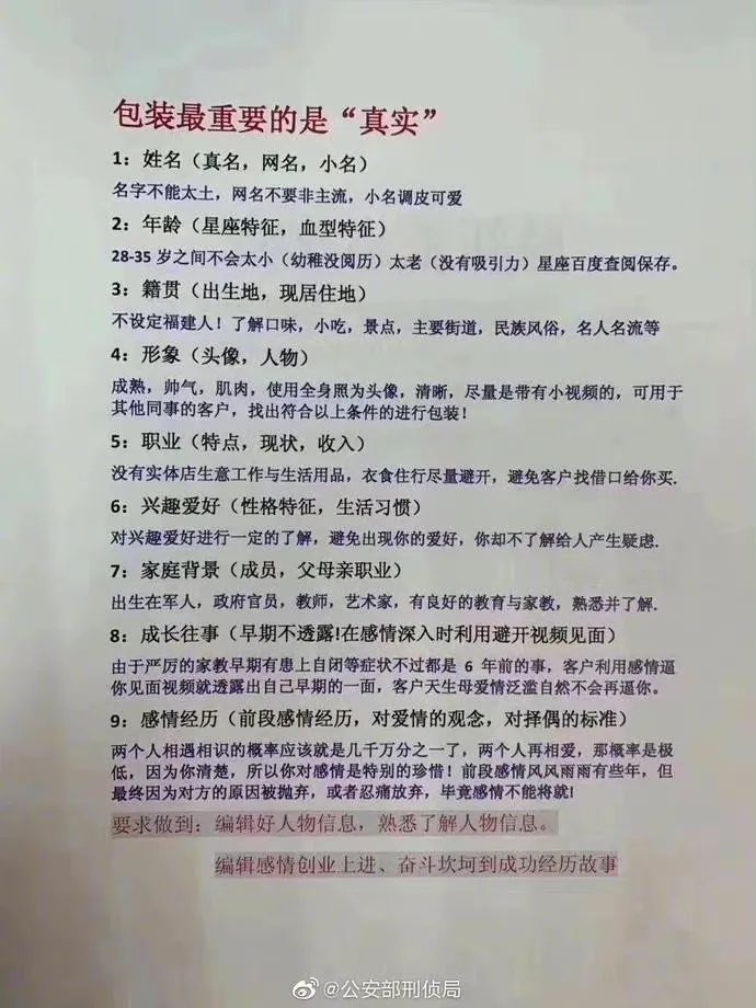 综合这份攻略和警方破获的内部材料来看,每个诈骗团伙,都会对新人进行极其详细、全面的培训,具体到如何聊天打招呼,不能聊骚,语言要克制得体,并列举了种种避免尬聊的坑,如何使用“好哒”和“好嘛”等语气词,堪称社交媒体礼仪百科全书。