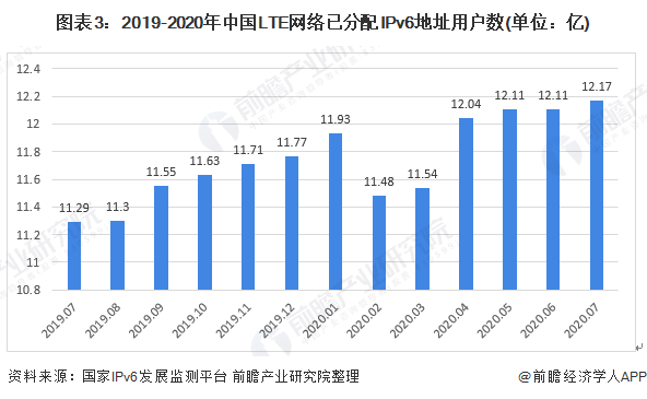 IPv6地址用户数方面,2020年7月我国三大基础电信企业LTE网络已分配IPv6地址用户数为12.17亿