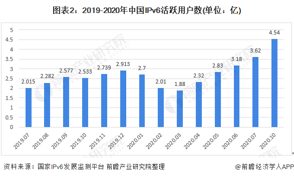 IPv6活跃用户数方面,截至2020年10月我国IPv6活跃用户数4.540亿