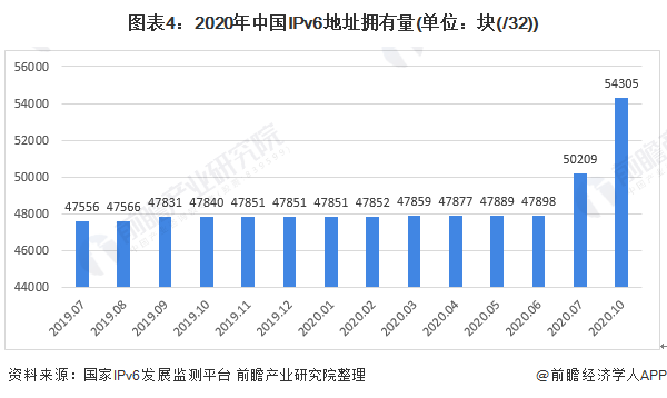 IPv6地址拥有量方面,截至2020年10月我国已申请IPv6地址资源总量54305块(/32)