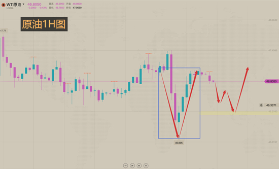 现在的原油走势清晰,操作思路明确,日内操作只需等待行情回落46附近后做多即可。
