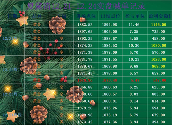 周四行情整体呈宽幅震荡走势,亚盘黛清通知学员1879进场空单,在1873位置手动止盈出局。欧盘通知学员1879位置进场空单,在1873位置手动止盈出局。美盘通知学员1873现价进场多单,在1877位置手动止盈出局。