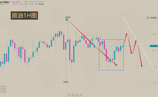 从原油一小时图来看,上行通道目前依旧有效,油价虽然刺破了通道下轨支撑,但是最终实体收盘价依旧收在了通道内,而从油价触及通道下轨的反应来看,下方的买盘支撑还是较强的,两次测试皆未跌破,现在行情又来到了48.0附近,指标方面来看,布林带三轨持续走平,MACD指标快慢线粘合缠绕,能量柱放量不明显,说明行情依旧没有脱离震荡,日内操作方面依旧去围绕上行通道上下轨操作即可,上轨阻力在48.6,下轨支撑在48。不排除今天油价选择通道破位,鉴于日线更倾向于头部的形成看回调,所以担心破位的朋友建议以空为主。综合来看,下周原油短线操作思路上夏黛清个人建议以高空为主。