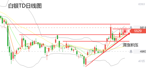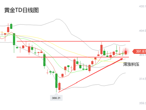 白银TD:同国际白银一样,最近两周白银TD滞涨积压,银价在去年9月下旬跳水位置遇阻,目前走势高位震荡整理。
