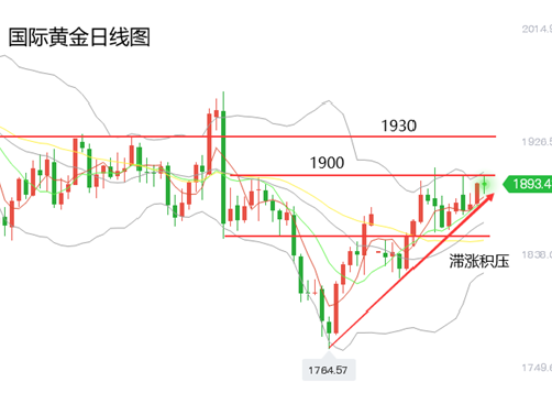 国际黄金:最近两周受节假日因素影响,金价整体波动不大,走势维持震荡整理,上方1900美元关口形成主要压力区域。