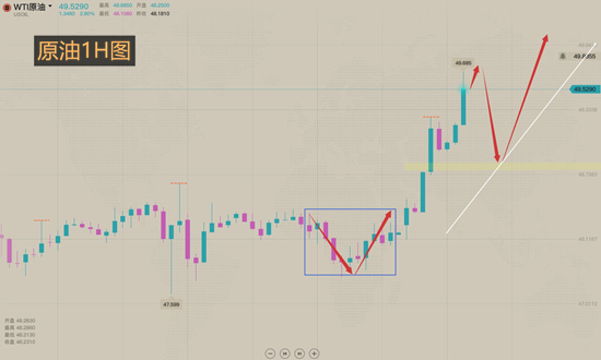 早盘上升后欧盘继续看延续,午盘的结构价格就不能出现快速的回撤,以及大幅度的回撤,回撤的幅度越大就会压缩上升的空间,高位震荡是延续。高位震荡震荡后的回撤是诱空,回撤只是加快速价格二次的上升。分水岭支撑48.1附近一线。早盘上升后午盘或欧盘前价格回撤的支撑48.8-6附近区域。