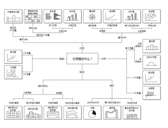 那知道了,基础图表的类型,那怎么去选择。国外专家Andrew Abela他将图表展示的关系分为4 类:比较、分布、构成、联系。然后根据这个分类和数据的状况给出了对应的图表类型建议。当我们不确定使用什么类型的图表的时候,可以参考下这个图。