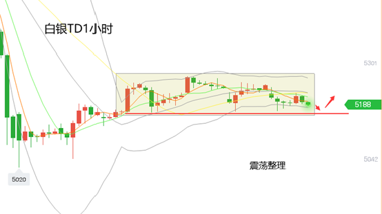 总体而言,白银TD遇阻回落后,上方压力逐渐增强,走势转而偏弱震荡整理,但目前跌幅有限,向下破位之前依旧可关注5170元附近支撑,向上看一次反弹,上方关注主要阻力位置可分别尝试做空。