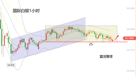 下方支撑:关注25美元整数关口位置,也是日内银价回落低点附近,4小时布林带下轨和周线布林带中轨24.88美元附近,日线布林带下轨24.46美元附近。