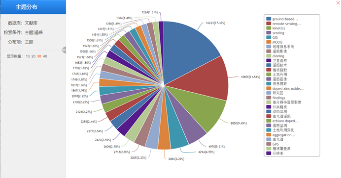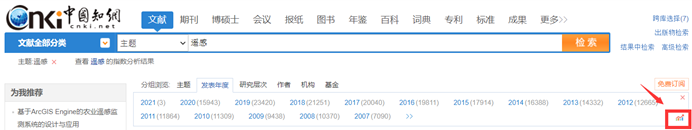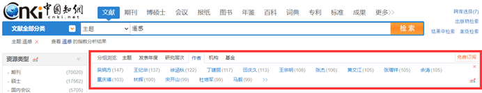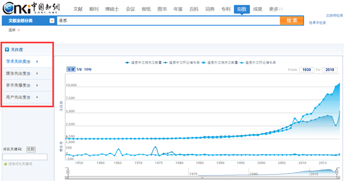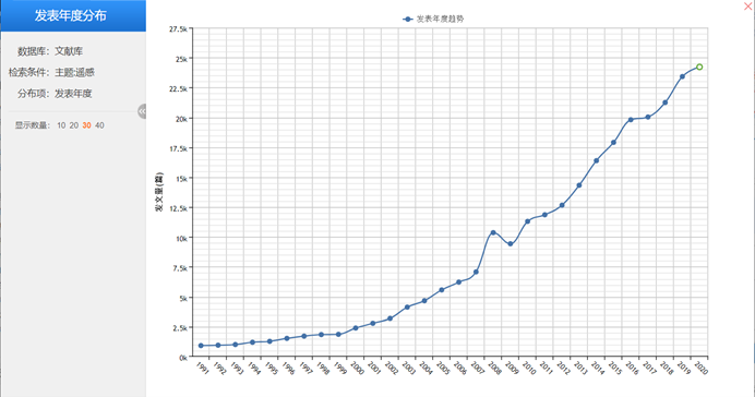 以某一关键词进行检索(以关键词“遥感”为例),通过“被引”排序方法进行排序,筛选出研究领域中的高应用度、高影响力文献。