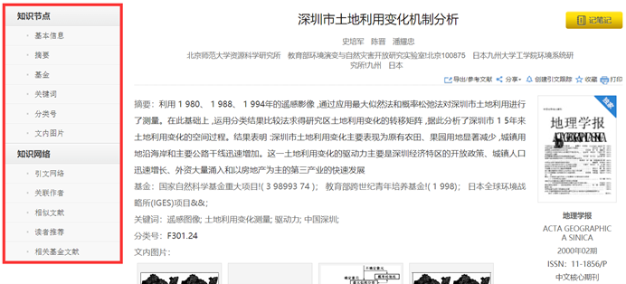 通过“知网节”功能(点击左侧“知识节点”和“知识网络”)了解该文献的详细信息(总库):