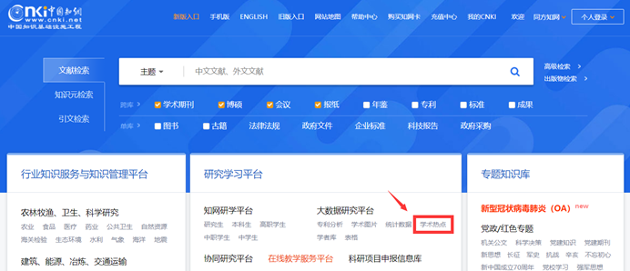 在知网首页选择“研究学习平台”模块中的“学术热点”,左侧选择学科领域,可查看对应领域的相关学术热点。