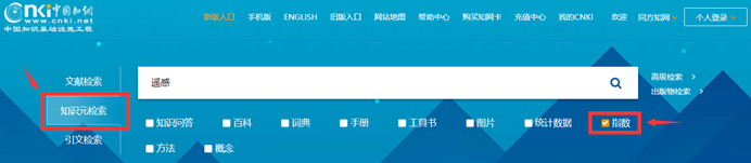 一框式检索栏处选择“知识元”,勾选“指数”,输入关键词并检索;