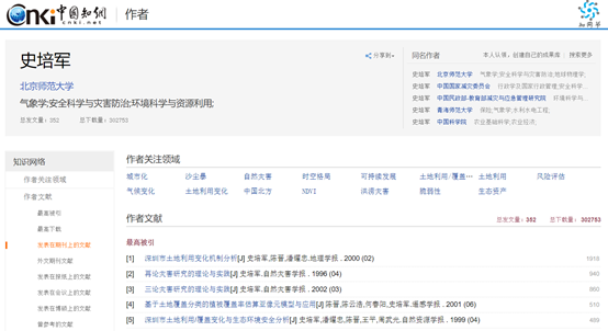 点击作者名字可以进入作者知网节,得到机构、作者关注领域、作者文献、合作作者等信息;