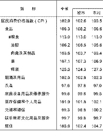 价格水平结构性上涨。居民消费价格上涨2.9%,比上年涨幅扩大2.9个百分点。其中,城市上涨2.6%,农村上涨3.5%;消费品价格上涨3.5%,服务项目价格上涨0.8%。居民消费价格结构性上涨特征明显,食品价格上涨8.3%,拉动价格总水平上涨2.8个百分点,是居民消费价格上涨的主要因素。农业生产资料价格上涨3.0%,工业品出厂价格上涨7.2%,原材料、燃料、动力购进价格上涨9.3%,房屋销售价格上涨6.7%,其中新建房上涨7.1%。