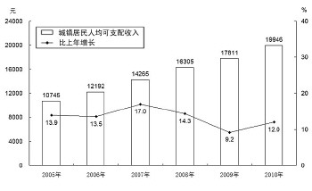 图8 2005-2010年城镇居民人均可支配收入及增长速度