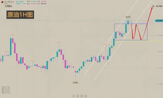 日线来看原油从今年低点以来启动上涨,整体来看可能启动新的推动浪。小时图看原油在53.93结束了上涨,原油展开了高位震荡模式,整体看来还是维持震荡整理,结构上看原油经过两次三波运行,短期仍然有可能向上运行,操作上建议今日逢低做多。