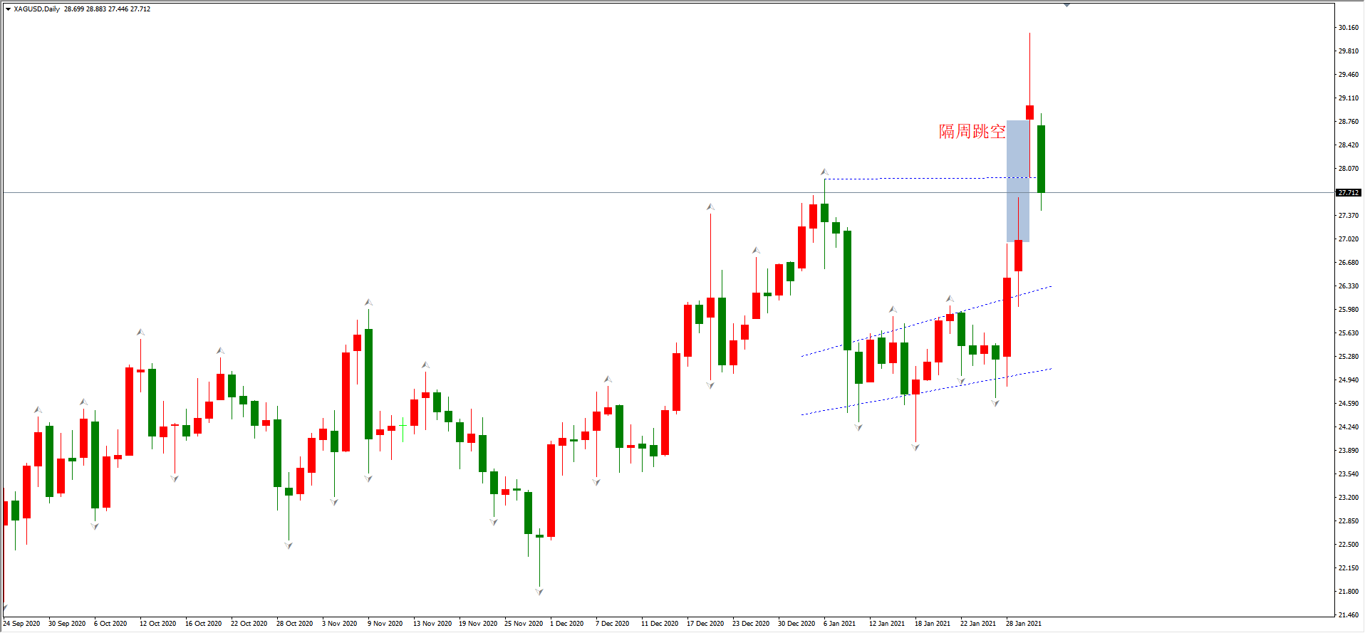 短期的战绩是瞩目的,美国多家白银线上零售商表示,由于突如其来的巨大需求,他们已经没有多余的银条和银币可供出售;国际白银市场也有异动,上周五白银收盘价为27美元/盎司,本周一开盘价位28.79美元/盎司,隔周出现向上跳空。长期的隐忧也不能忽视,首先是白银的技术走势: