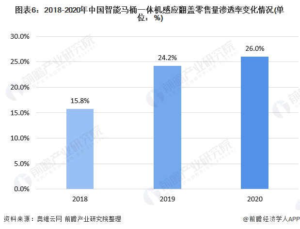 随着人们对产品智能化要求的提升,智能化程度更高的产品的渗透率不断提高,以感应翻盖为例,目前我国智能马桶一体机感应翻盖零售量渗透率不断提高,2020年智能马桶一体机感应翻盖零售量渗透率由2018年的15.8%提升至26%。