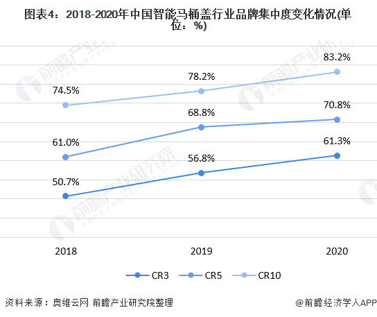 相较于智能马桶一体机,智能马桶盖市场集中度相对较高,根据奥维云网公布的数据显示,2020年我国智能马桶盖品牌集中度CR3为61.3%,CR5为70.8%,CR10为83.2%,均较2019年有所提升,主要是基于智能马桶盖市场相较于智能马桶一体机而言发展相对成熟,头部品牌优势更加明显。