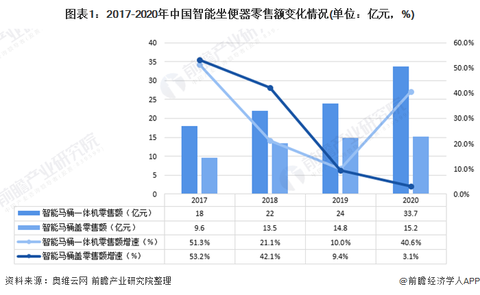 近年来,随着我国智能坐便器需求的不断增长,我国智能坐便器市场规模持续扩大,根据奥维云网公布的数据显示,2019年我国智能马桶一体机零售额为24亿元,同比增长10%,2020年智能马桶一体机零售额达33.7亿元,同比增长40.6%;2019年我国智能马桶盖零售额为14.8亿元,同比增长9.4%,2020年我国智能马桶盖零售额达15.2亿元,同比增长3.1%。