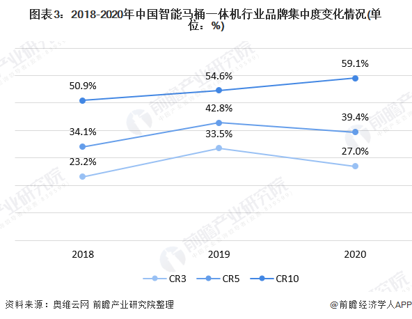 从我国智能马桶一体机品牌集中度来看,2020年一体机行业品牌集中度CR3仅为27%,较2019年有所下降,目前头部品牌以传统卫浴品牌为主,越来越多的代工品牌参与市场竞争,国外品牌也纷纷入局,一体机行业市场相对分散。
