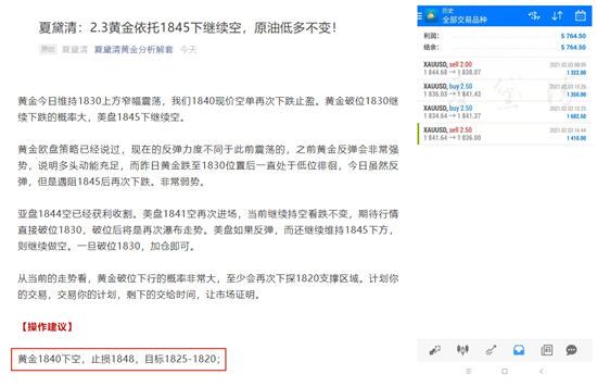 周三黄金整体呈下跌走势,亚盘黛清通知学员1844进场空单,在1838位置手动止盈出局。欧盘黄金有了小的回调,黛清通知1836进场多单,在1841位置手动止盈出局。1834位置通知学员进场多单,在1841位置手动止盈出局。美盘黄金持续下跌,黛清通知学员1841进场空单,止盈位给到1836,空单如期到达止盈出局。思路清晰方向明确,每单布局有理有据,目的明确,才能做到有的放矢。再多华丽的语言都不及获利来的实在,再辉煌的过去不及现在的盈利重要。
