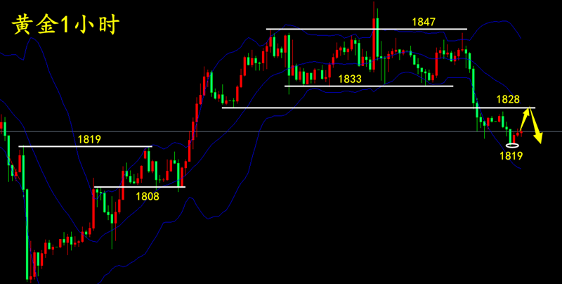 黄金昨日日内震荡,美盘黄金破位下跌,今日黄金开盘续跌到达1819一线反弹。目前黄金下破1833关键支撑后看跌,小时线布林带下行。日线图上黄金刺破布林带中轨,始终被压制回撤,日线图录得大阴线!