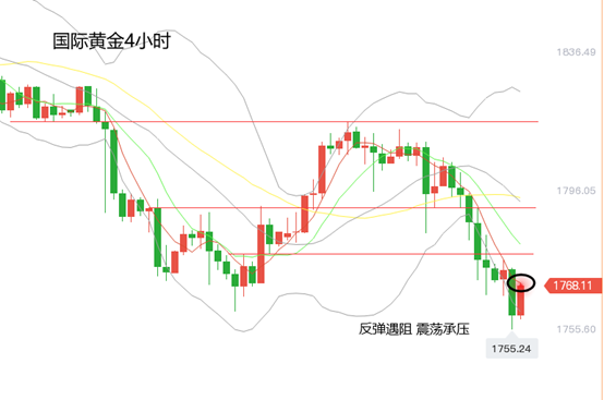 金价上方阻力,重点关注4小时5日均线位置,这是黄金跌破1800美元关口位置口,主要的压力线,目前价格在1769美元附近,突破这里黄金跌势将得到缓解,继续关注4小时10日均线1780美元附近,金价上破这里,黄金大概率止跌企稳,短期走势展开低位震荡整理,上方空间继续关注4小时布林带中轨与日线5日均线所在1790美元附近,以及1800整数关口位置,和日线布林带中轨1810美元附近,其中日线布林带中轨,是黄金今年1月上旬大幅跳水后,金价主要的压力区域。