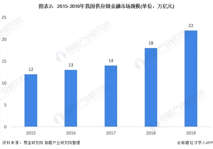 根据易宝研究院数据显示,2015-2019年,我国供应链金融市场规模整体呈现逐年递增的趋势,截至2019年底,我国供应链金融市场规模达到22万亿元,供应链金融市场迎来快速发展。
