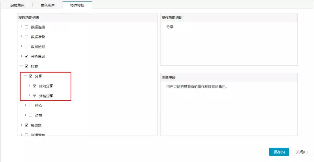 在操作授权中包括站内分享和外链分享设置项的操作选项,拥有站内分享操作权限才可以进行分享操作。