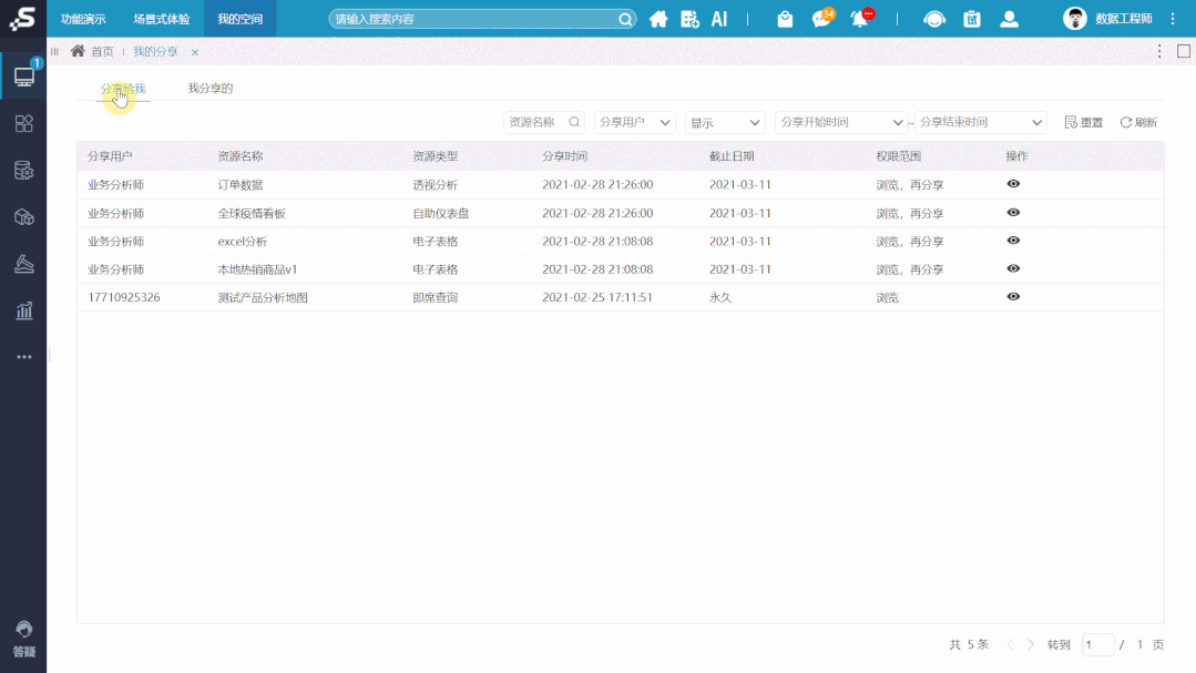 通过“我的分享”页面,展示了分享给我和我分享的资源等的信息,支持对分享信息进行统一管理。