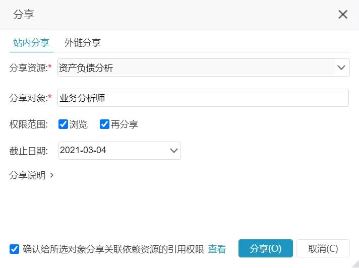 用户完成的资源,比如仪表盘、报表等,觉得效果不错,先分享给部门内的部分人员来查看,部门的相关人员收到通知点击即可查看资源,但是不能再分享给其他人。用户还可以设置截止时间,如果超出分享时间,系统也会提醒用户分享失效。