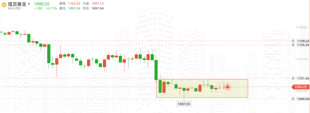 黄金大跌30美元。在美债收益率和美元指数大幅走强的背景之下,黄金大幅下挫30美元,目前已经跌至1700美元下方,最低触及1687.24美元。