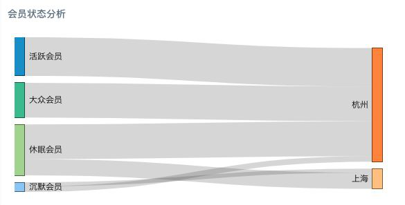 △多讲一点:桑基图主要由边和节点组成,边代表了流动的数据,流量代表了流动数据的具体数值,节点代表了不同分类。边的宽度与流量成比例的显示,边越宽标示数值越大。桑基图的特点是“能量守恒”,数据从开始到结束,总量都保持不变。