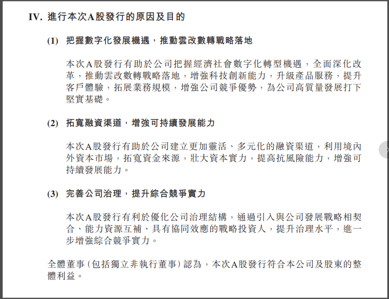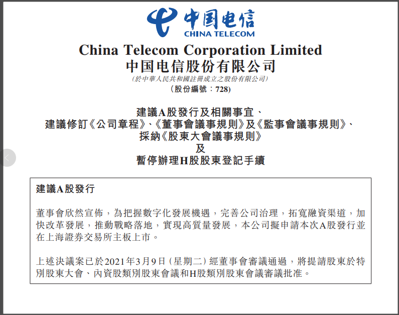 观察者网·大橘财经讯(文/周昊 编辑/周远方)3月9日下午,中国电信(00728.HK)港股发布公告,为把握数字化发展机遇,完善公司治理,拓宽融资渠道,加快改革发展,推动战略落地,实现高质量发展,本公司拟申请A股发行并在上海证券交易所主板上市。