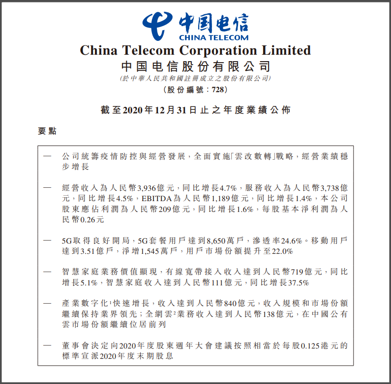 当天,中国电信还公布了2020年度业绩。截至2020年12月31日,中国电信经营收入为人民币3936亿元,同比增长4.7%;服务收入为人民币3738亿元,同比增长4.5%;归母净利润为人民币209亿元,同比增长1.6%。